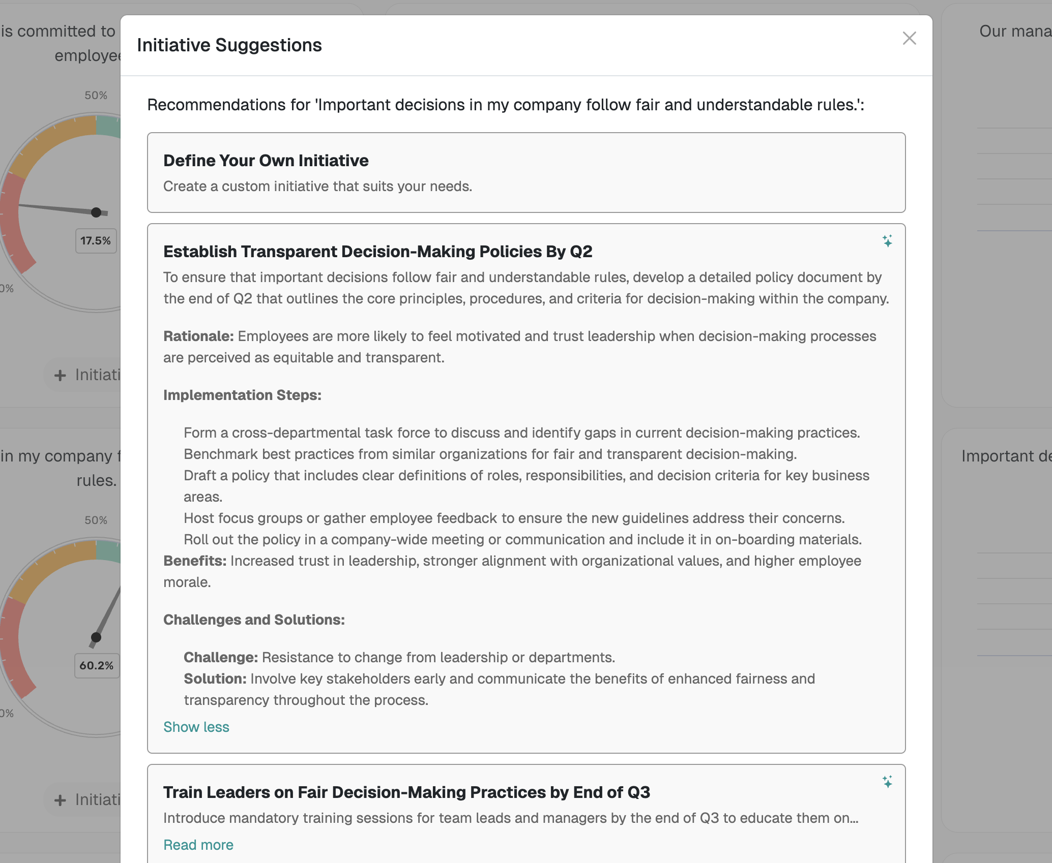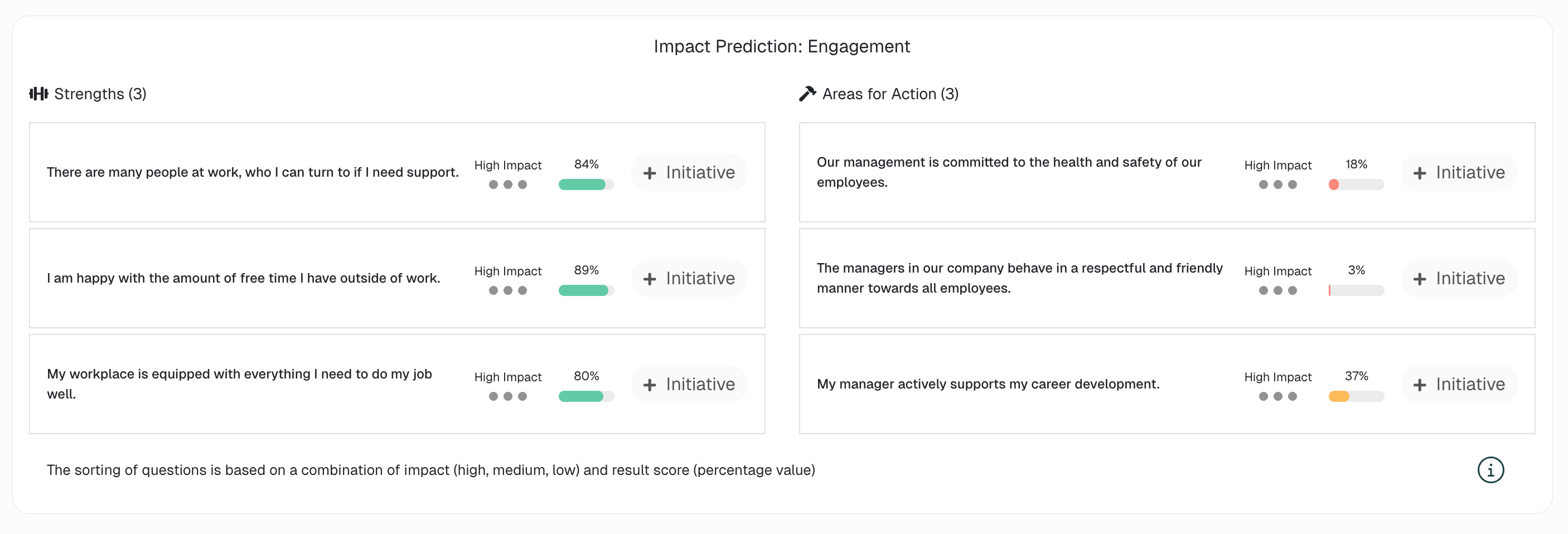 After a survey, it’s often a challenge to translate insights into sustainable change. The AI Initiatives module offers the necessary support and structure to efficiently guide these processes and drive transformation. An absolute added value to make change tangible and successful.