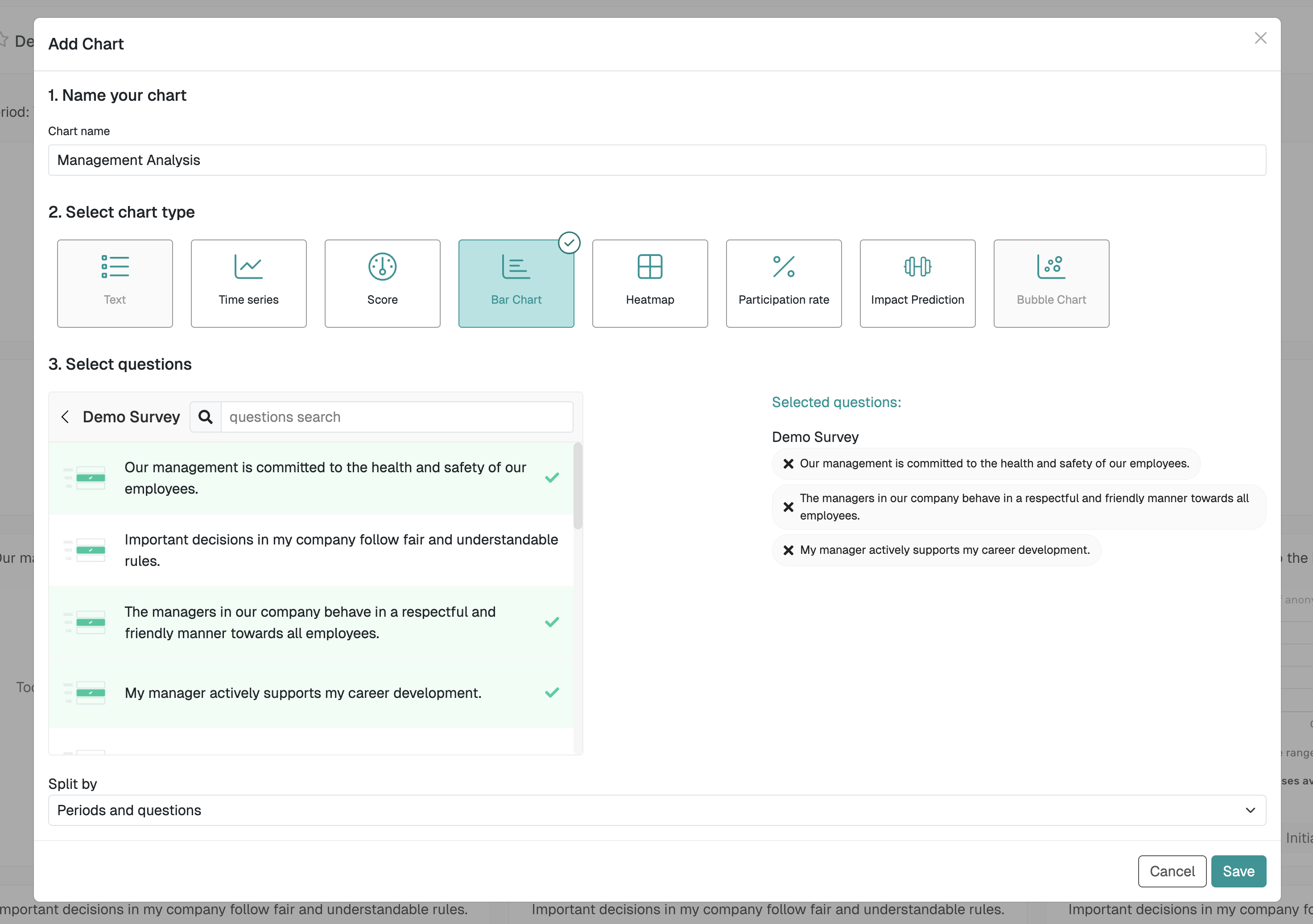 Automatically create your dashboard from any survey or customize it choosing from a variety of charts types. Group questions around the same topic, and slice and dice data according to location, gender, or other criteria